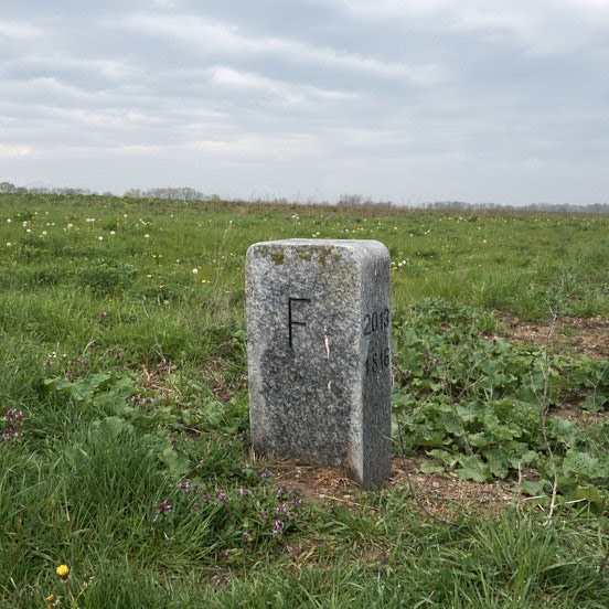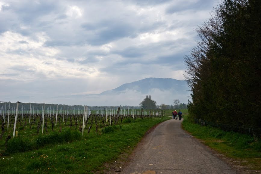 | Avant l’arrêt de bus, prenez à gauche la route de Gy sur 200 mètres et filez tout droit sur le Chemin des Communes de Gy. Ce chemin est sur France. Longez, au début, les vignes du domaine du « Clos de La Zone » qui a la particularité d’avoir ses vignes sur France et sa vinification sur Suisse. Observez plusieurs bornes frontières, elles sont toutes numérotées et sur le plat de leurs parties supérieures, le tracé de la frontière est toujours indiqué. Elles ont été posées après la création du Canton de Genève en 1816. | ![]() ![]() ![]() |