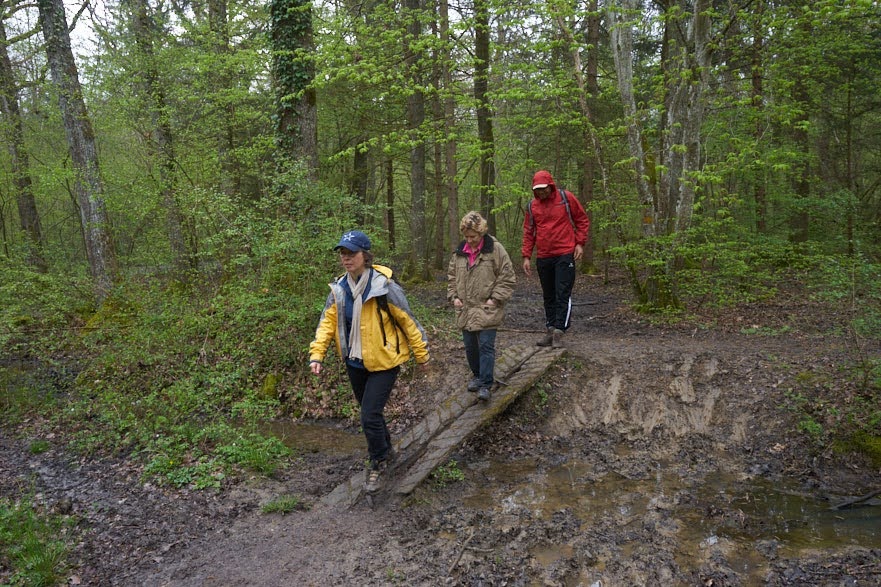 | Suivez ce chemin à gauche sur 100 mètres, puis prenez à gauche un sentier qui entre dans la forêt (passez à côté de la barrière en bois. La zone est parfois humide). Vous serez en pleine forêt et de nombreuses bornes frontières jalonnent votre parcours. Entre les bornes n° 166 et n° 165, prenez à gauche une petite passerelle (notre photo) qui vous ramènera sur France dans les bois de Foncenex. | ![]() |